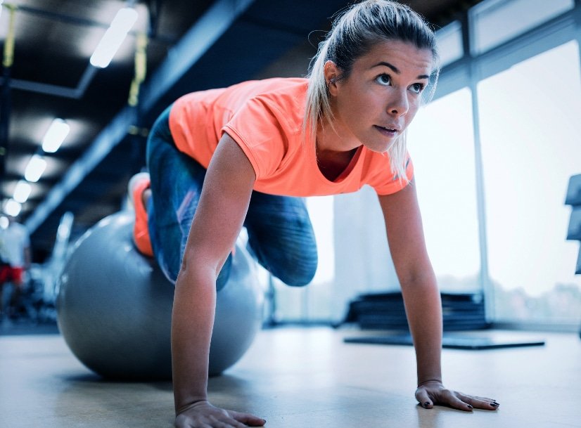 This exercise is useful in strengthening and tightening all muscles in the body. It is required to lie on the ground, straight, with the palms of the hands on the ground, flat, equal to the shoulders and in the same direction, with the torso lowered so that the elbows form a 90-degree angle. Be careful to keep the elbows close to the body. Then, the rubber ball is placed under the body, and the body is lifted from the ground, by the arms, with the abdomen being pulled inward, so that the shape of the body becomes in the form of a straight line from head to feet. The body shall be lowered, taking into account that it remains in a straight line towards the rubber ball to approach it. Then you return to the starting point.