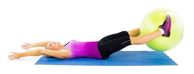 This exercise helps strengthen the thigh muscles, including the abdominal muscles. It is applied as follows: After lying on the back, with the body stretched and the arms extended in line with the body, the legs are raised over the rubber ball, while maintaining the integrity of the body. Then, the knees are bent, and the ball is rolled toward the hands, until it touches the toes. Then, slowly return to the starting points.