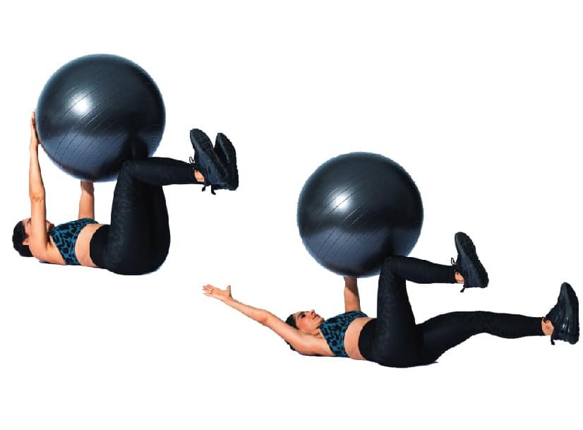 This exercise helps strengthen back muscles and keep the spine stable. It is performed as follows: After lying on the ground, with arms extended, and legs bent at a 90-degree angle, the rubber ball is carried and placed between the knees. Then, the ball is held in the right hand and the left knee, and the right leg is moved with the left arm to a distance of six inches forward, back to the starting point.